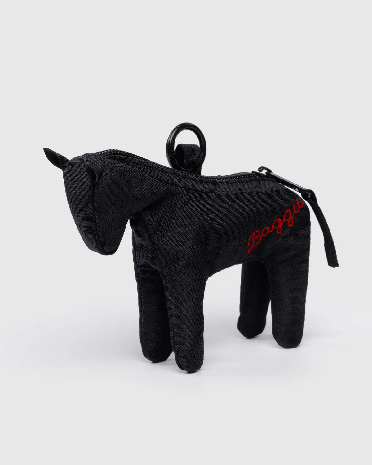 This horse-shaped bag charm from Baggu has a metal keyring with clip, embroidered branding, and is constructed from heavyweight nylon. 5.75″ W x 5.2″ H x 1″ D.